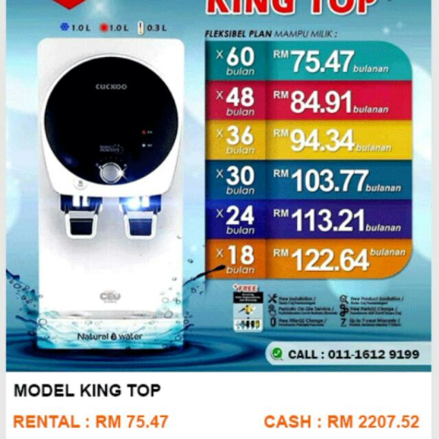 Extended Sinar Promo Sinar Promo King Top Rm66 extended till 30 June get it while stock last. With the CUCKOO GOOODPLAN you can own the King Top Water Purifier at a much lower price than the original and save more. Penapis Air King Top RM60 XCEL RM70 Promo TILAM CUCKOO FREE Katil bernilai RM600 Sila isi di bawah untuk dapatkan info promosi Cuckoo.